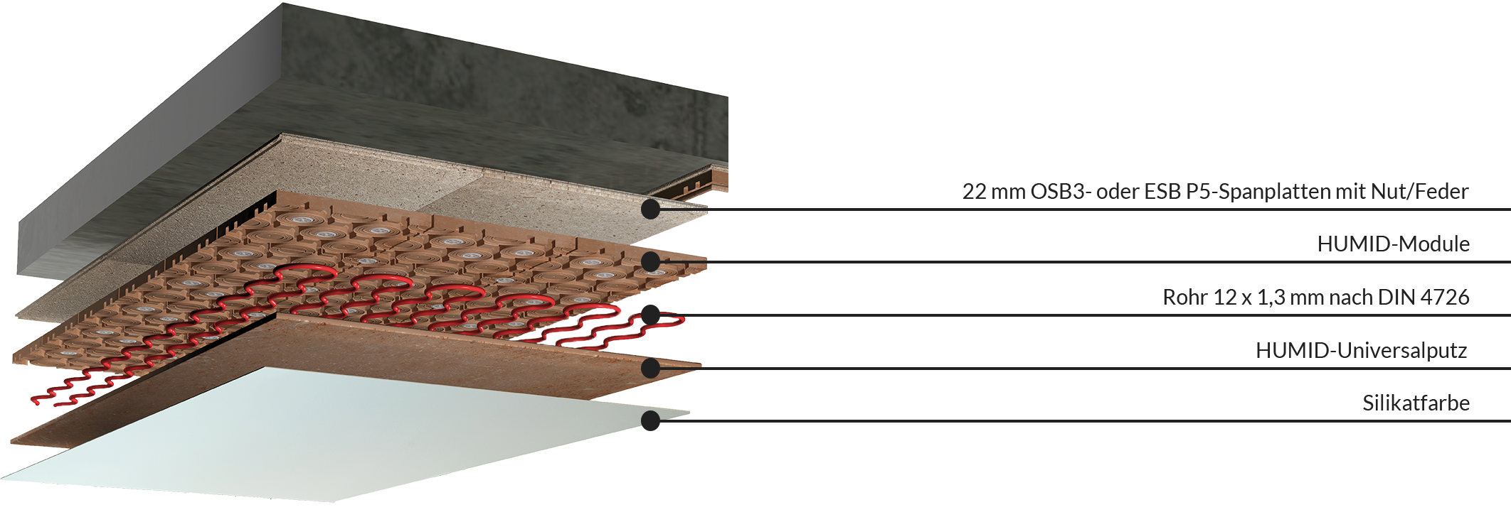 Die Natur-Klimadecken übernehmen die Raumkühlung in ähnlicher Geschwindigkeit wie Fan Coils. Das liegt am Systemaufbau, einem speziellen Regelungskonzept und am hoch leitenden Trägermaterial, den HUMID-Modulen. Mehr dazu finden Sie hier.